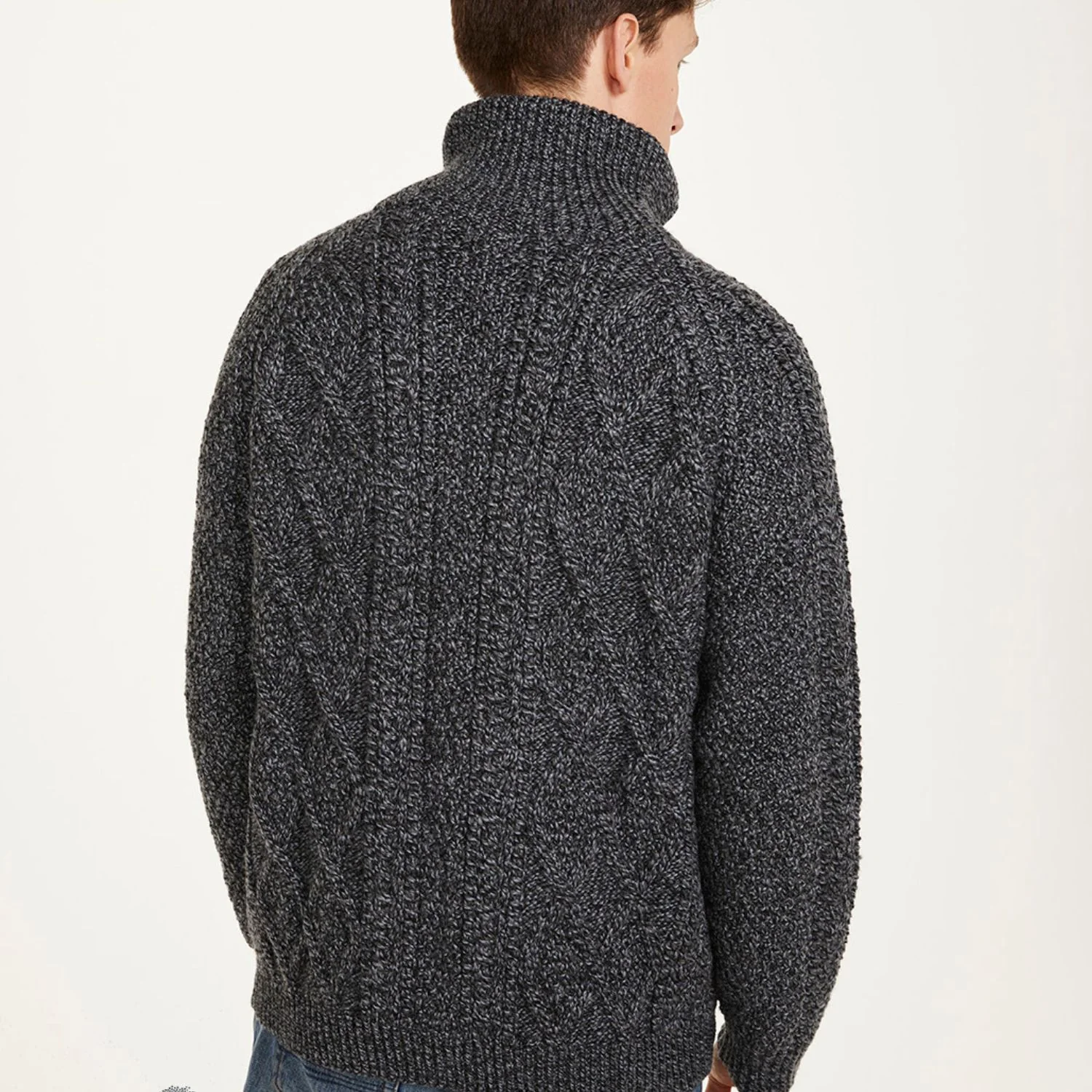 Aran Woollen Mills is famed for their high quality knitwear and this stunning charcoal colour in this sweater is sure to be a Winter staple for many years to come.