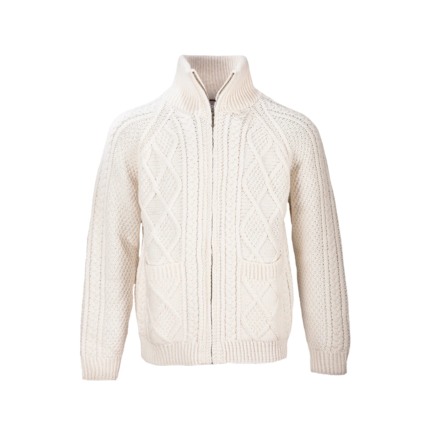 The intricate aran pattern details on this Irish sweater portrays many of the famous aran patterns such as the diamond, cable and blackberry.