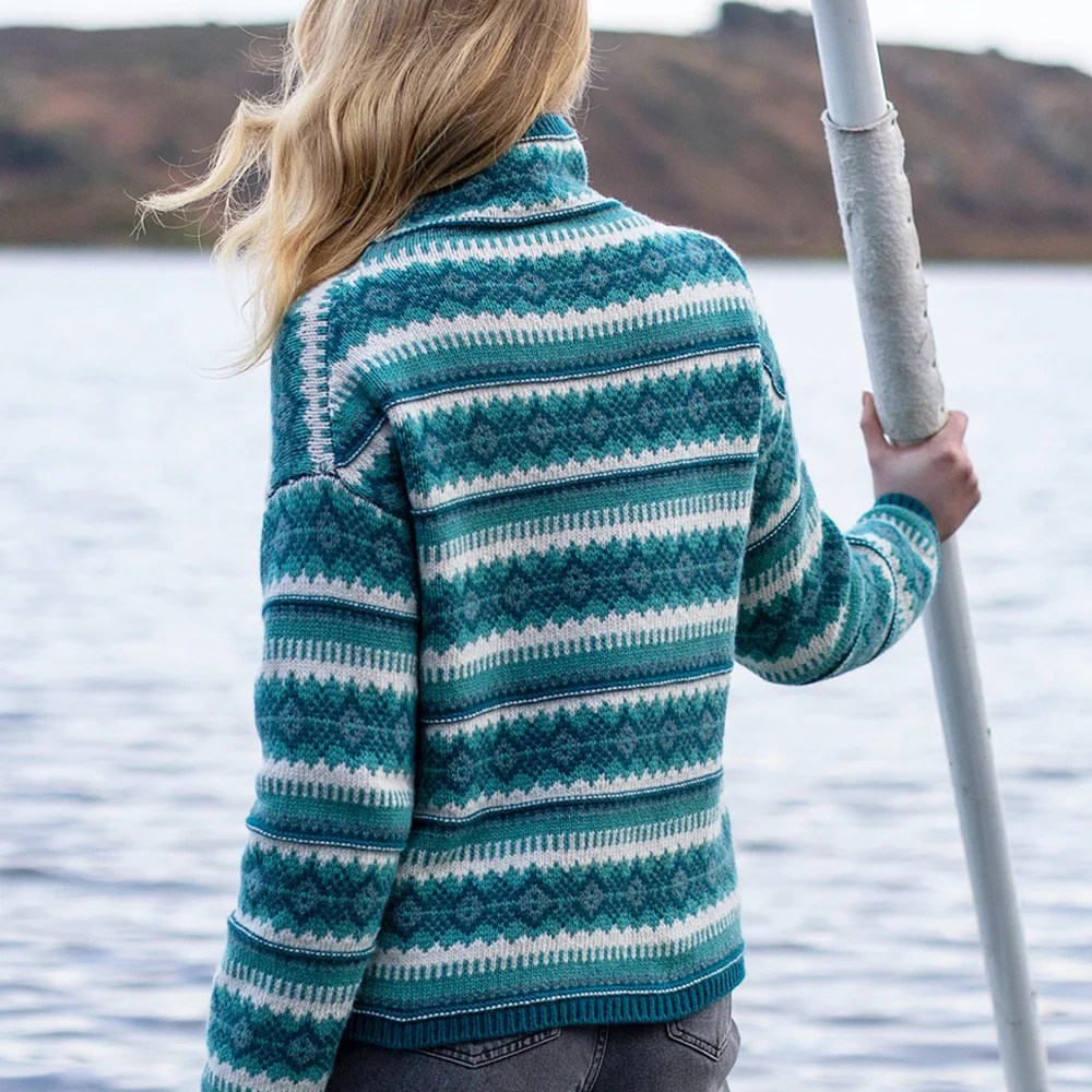 The intricate Fairisle pattern, featuring a beautiful blend of green and blue hues, adds a touch of traditional charm with a modern twist. The colorus are inspired by the serene and enchanting beauty of woodland landscapes, making this sweater a standout piece in any wardrobe.
